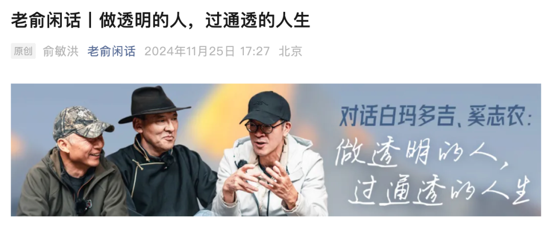 去年底,俞敏洪通过“老俞闲话”的公众号,记录了他和白玛多吉等好友的谈话分享,“做透明的人,过通透的人生”。