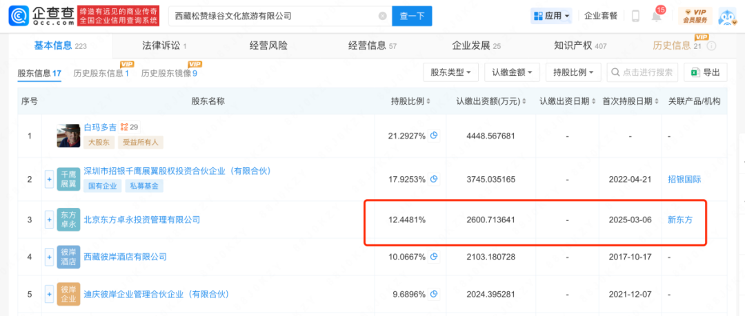* 新东方持股西藏松赞绿谷,大约12.4%;招银国际持股17.9%;白玛多吉持股21.3%。