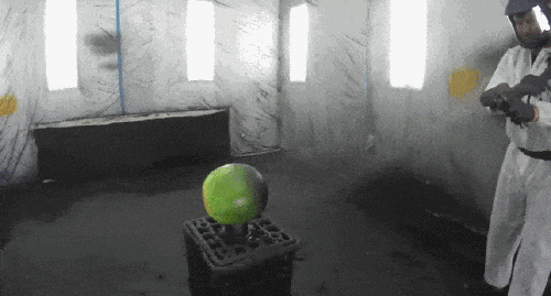 这段视频没有透露“防弹涂层”具体的成分和工艺,不过从实验内容和演示效果来推测,这里展示的大概是一种弹性体聚合物的保护涂层,它可能是通过喷涂的方式施加到西瓜表面的,涂层的成分可能是某种聚脲材料。
