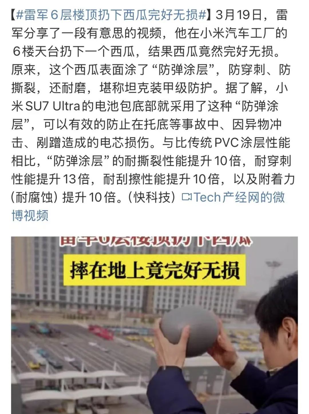 据说,这颗西瓜表面有“防弹涂层”,这种涂层也被用在小米汽车上,用来保护电芯免受损伤。