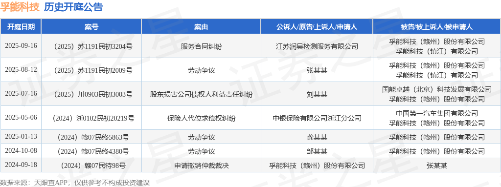 案号:(2025)苏1191民初3204号审理法院:镇江经济开发区人民法院案由:服务合同纠纷当事人信息: 原告/上诉人:江苏润吴检测服务有限公司 被告/被上诉人:孚能科技(赣州)股份有限公司、孚能科技(镇江)有限公司开庭日期:2025年9月16日根据统计,近一年内以孚能科技(赣州)股份有限公司为当事人的历史开庭公告有7则,其中案由为“劳动争议”的公告以3则居首,其次为“保险人代位求偿权纠纷”有1则,“服务合同纠纷”有1则。历史开庭公告如下: